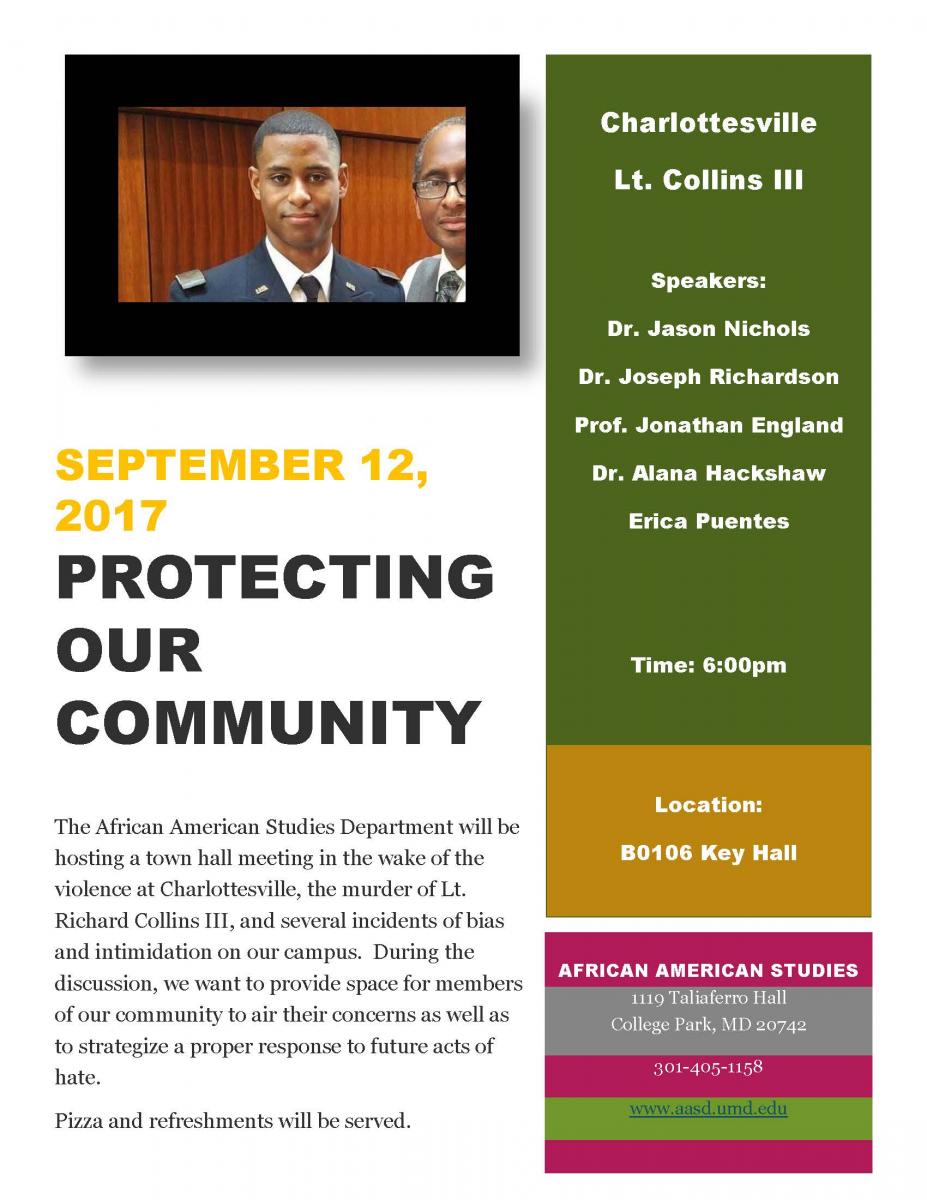 On Tuesday, September 12, 2017 The African American Studies Department will be hosting a town hall meeting in the wake of the violence at Charlottesville, the murder of Lt. Richard Collins III, and several incidents of bias and intimidation on our campus. During the discussion, we want to provide space for members of our community to air their concerns as well as to strategize a proper response to future acts of hate.